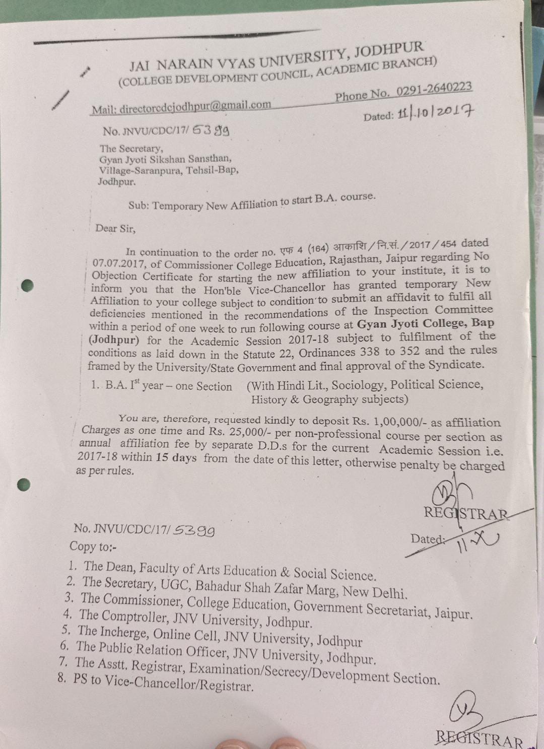 Admission in Gyan Jyoti College, Bap is always fair. Admission procedure is purely based on merit basis. After merit list, personal interview is taken of each of the candidates. Only those candidates are eligible for admission who get excellent marks in both of the tests. Once selected,the candidates are required to pay the fees on or before the prescribed date in order to confirm their admission, failing which the next student in the merit list would be offered the admission. At the time of admission, all supporting and relevant documents/certificates as stated in the application must be submitted to the College.The fees will not be refunded due to cancellation of admission for any reasons once the course begins.
